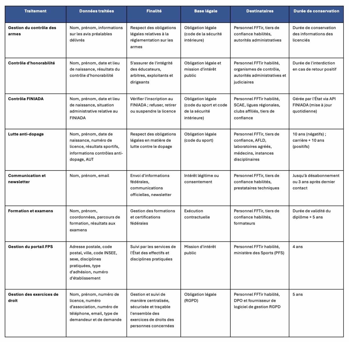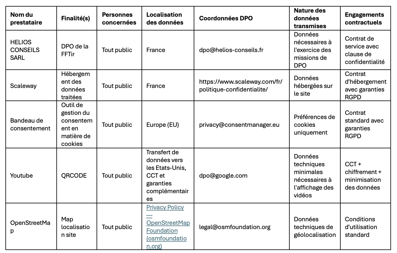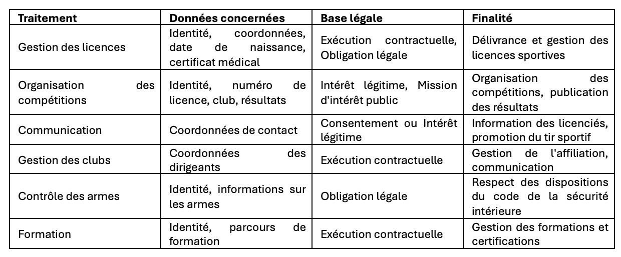 À toutes fins utiles, lorsque vous prenez contact avec la FFTir via d’autres canaux que le site internet, afin de vous apporter satisfaction, elle peut être amenée à traiter des données à caractère personnel. Voici un tableau récapitulatif des bases légales et finalités de nos traitements :