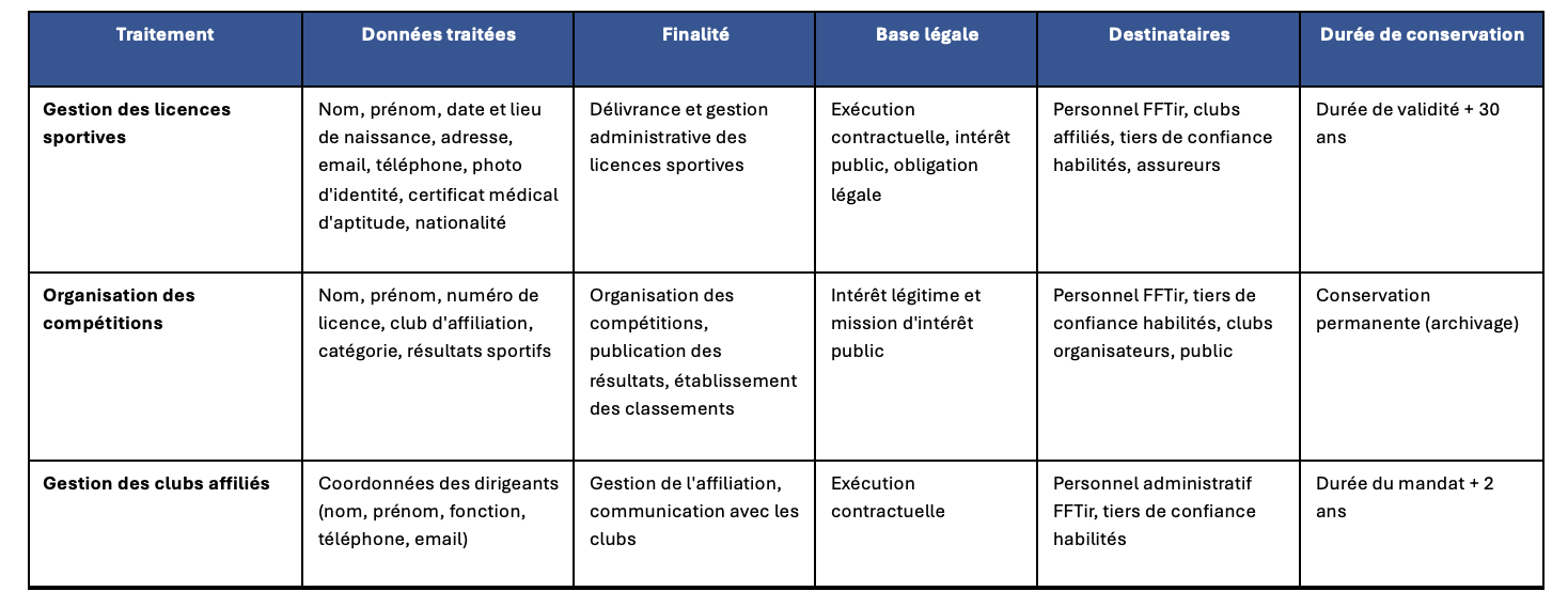 Les traitements suivants concernent les activités fédérales relatives aux licenciés de la FFTir et non le site internet www.fftir.org qui ne traite aucune donnée à caractère personnel.