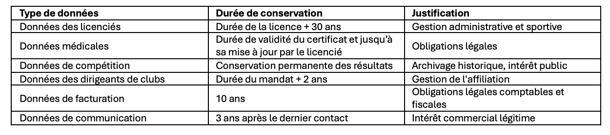 Le retrait de votre consentement ne remet pas en cause la licéité des traitements effectués avant ce retrait. Pour certains services essentiels qui nécessitent obligatoirement un consentement (comme l’inscription à une compétition), le retrait du consentement pourrait entraîner l’impossibilité de continuer à bénéficier du service concerné.
