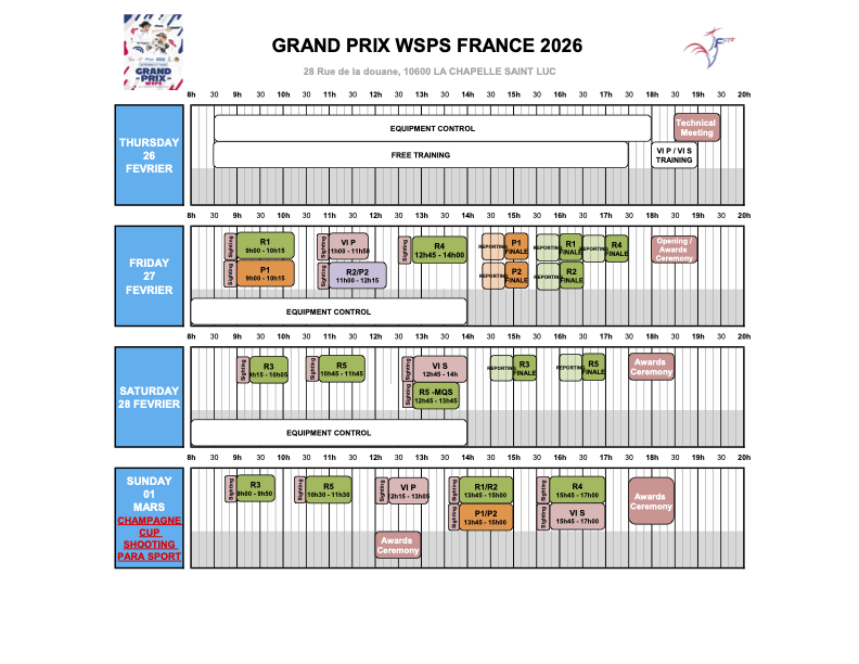 Cette année, le Grand Prix évolue et devient une compétition officielle internationale WSPS. La Ligue complète le Grand Prix en proposant un match supplémentaire pour chaque catégorie le dimanche 1ᵉʳ mars intitulé « Champagne Cup Shooting Parasport ».