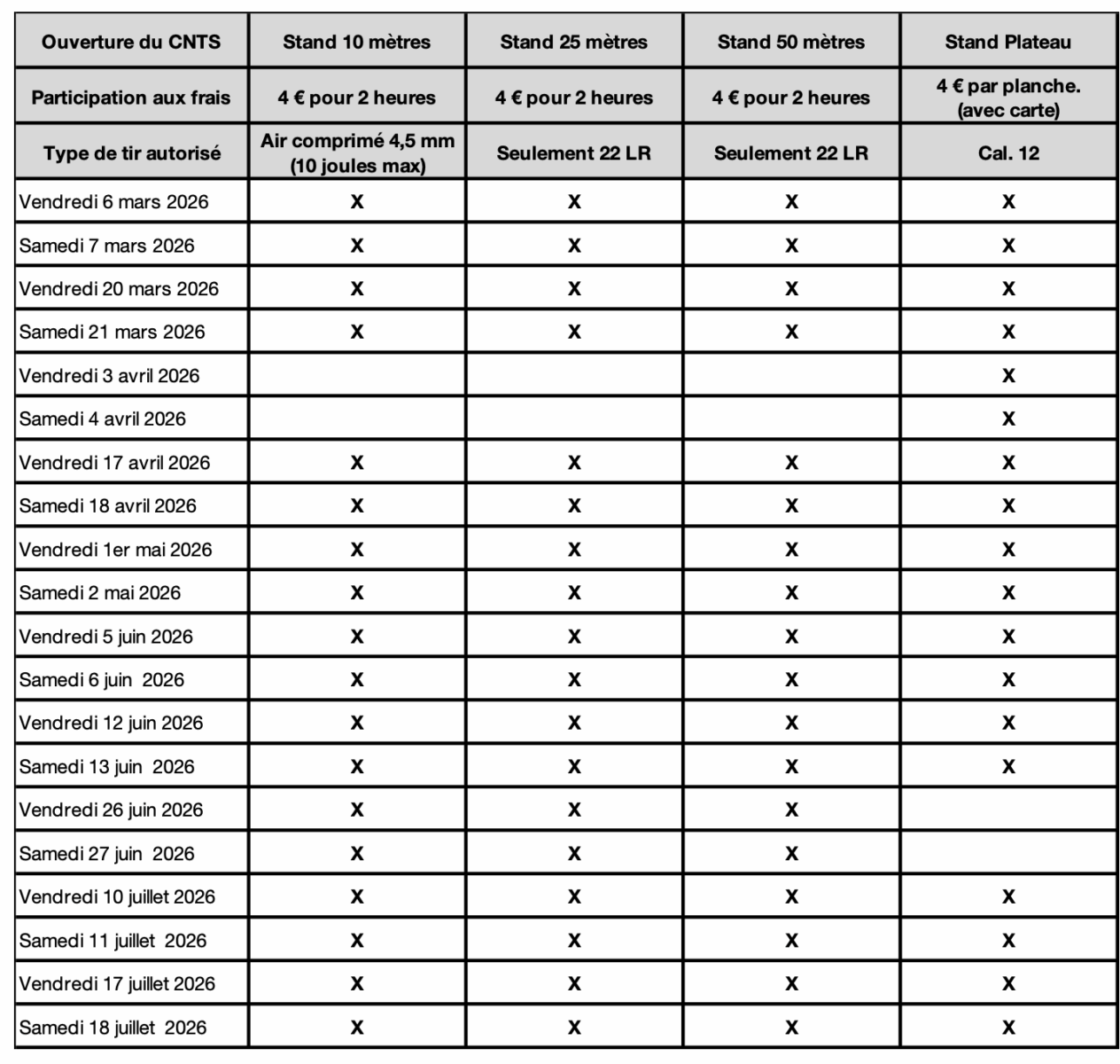 Le CNTS sera ouvert pendant 24 jours, de 9 à 17 heures, durant le premier semestre 2026. Chaque jour, quatre créneaux seront ouverts : 9-11h, 11-13h, 13-15h et 15-17h, exclusivement sur réservation : CNTS – Réservation de créneaux de tir.